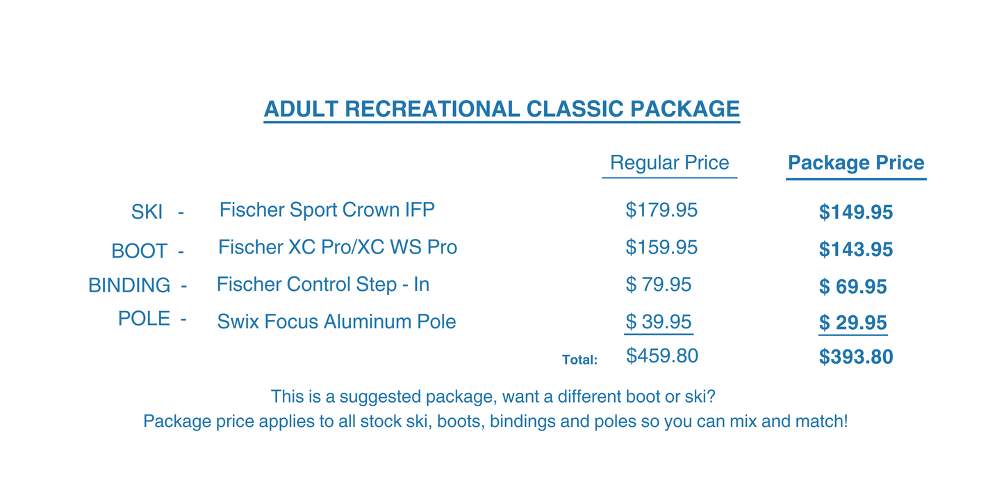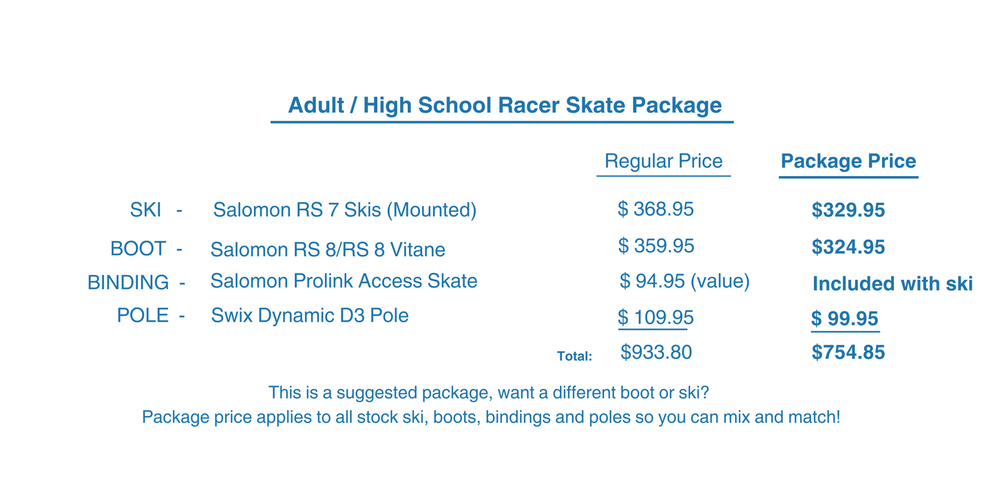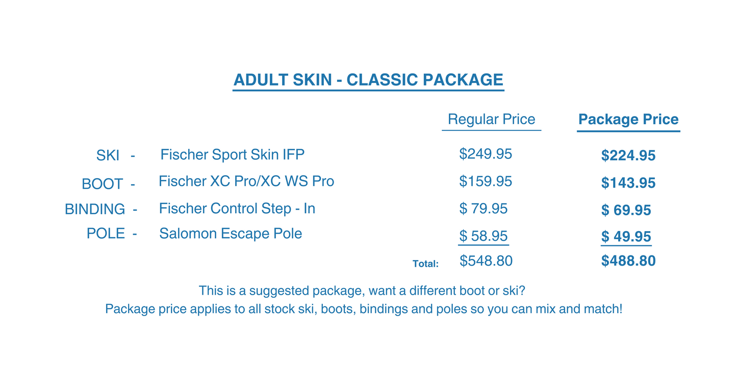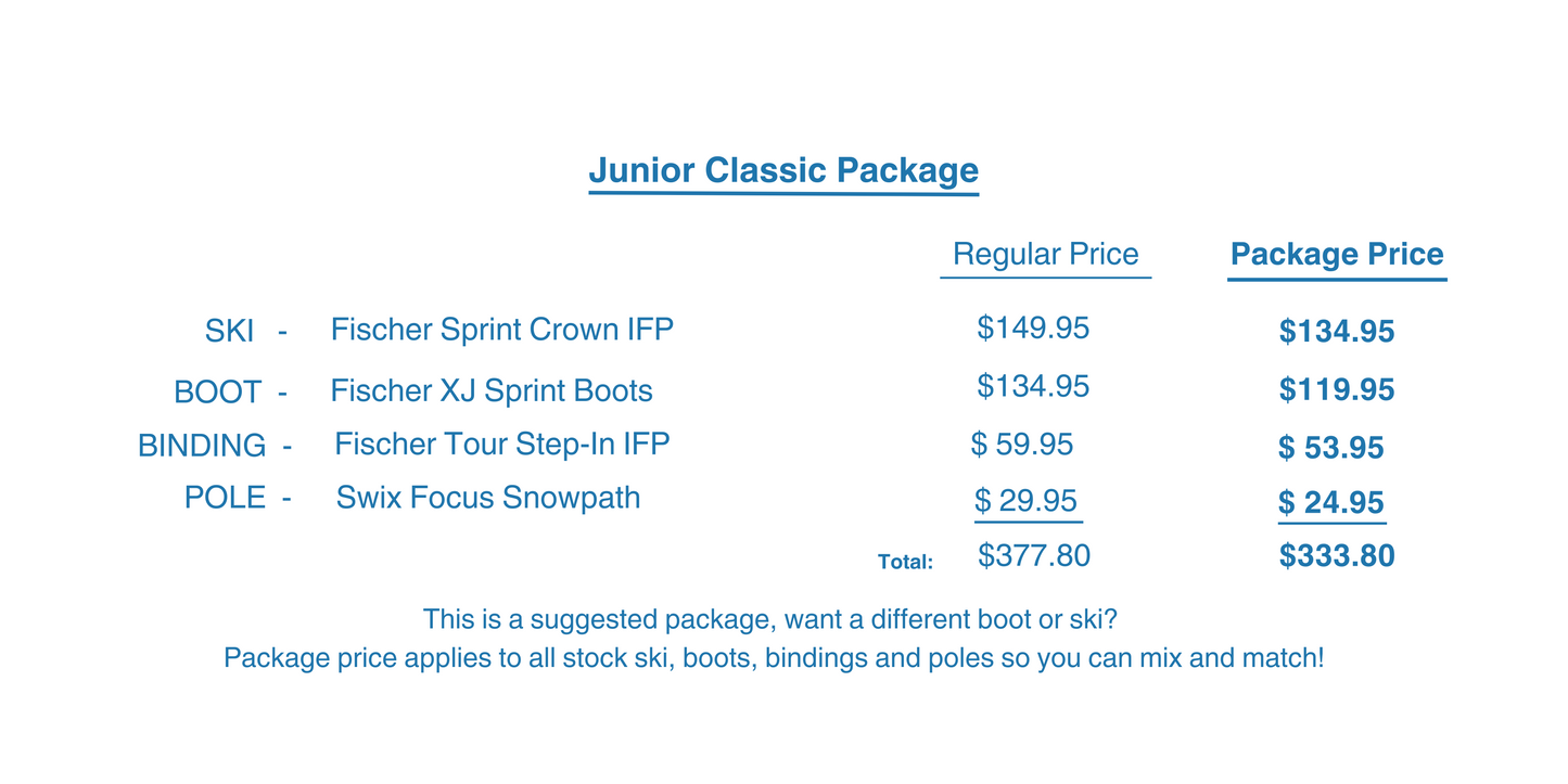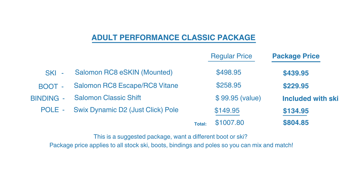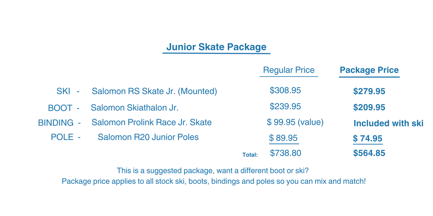 Below are some curated prices to give you an idea of how much things cost. These are just suggestions and we can help customize your ski package by changing out skis, boots, poles and binding to suit your needs.
