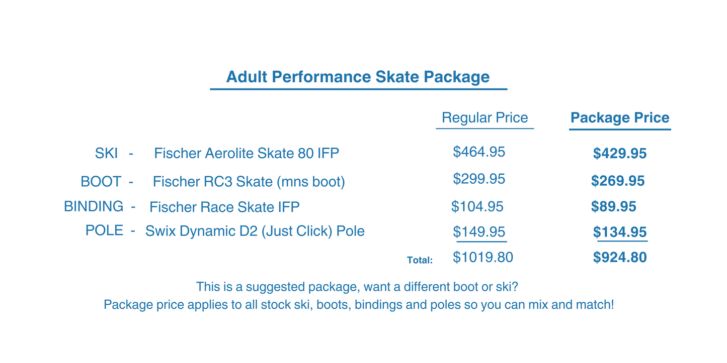 At Suntrail we offer package pricing (discounts off suggested MSRP) for any two or more items purchased in a ski package.