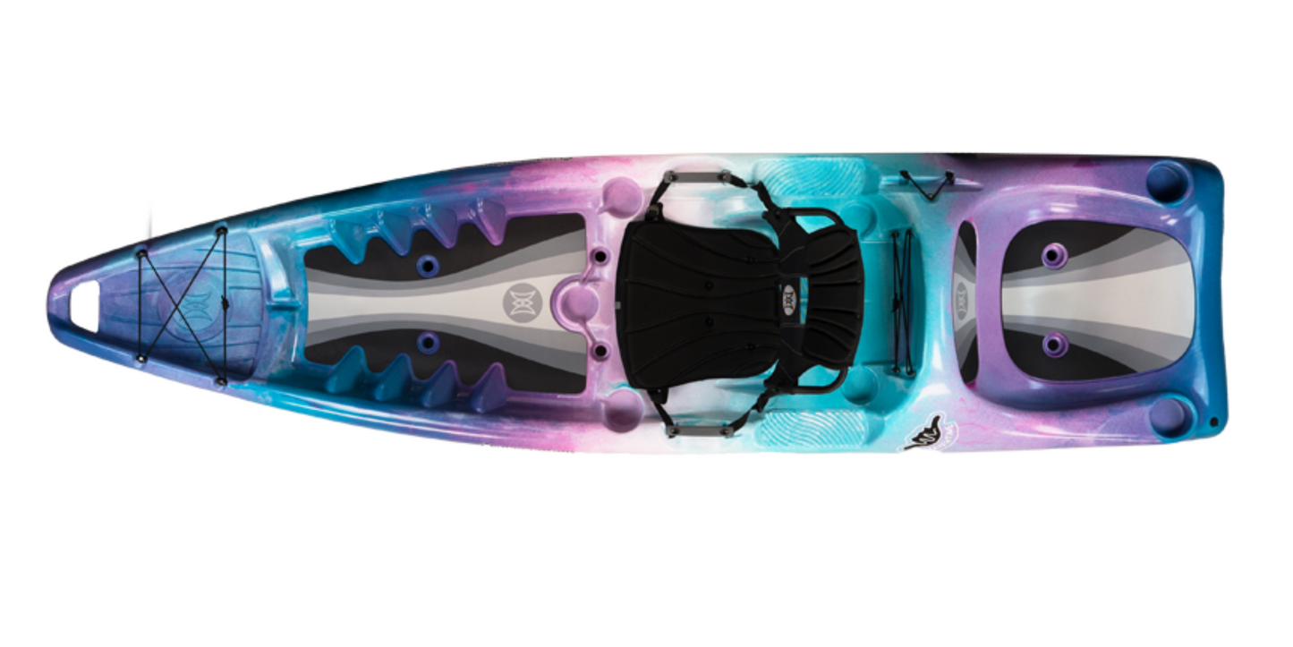 adjustable recline positions, creating the ultimate lounge to kick back, relax and catch some rays while floating about. Lightweight and fully stackable, with a plethora of handles, getting this kayak to the water is a total breeze. Affordable, easy-going, and great looking, the Tribe performs terrifically in light surf, lazy rivers and flat water.