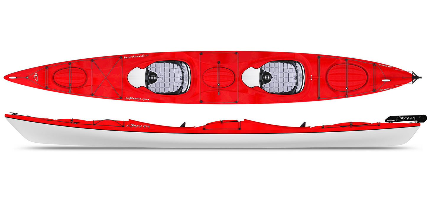 convenient centre day-pod. Outfitted for safety, comfort and performance, this sleek new tandem features Delta’s Contour 2 seat system, Press Lock Hatches, self-retracting comfort handles, extensive deck rigging, adjustable foot braces for and aft, and Delta’s no hassle rudder system.