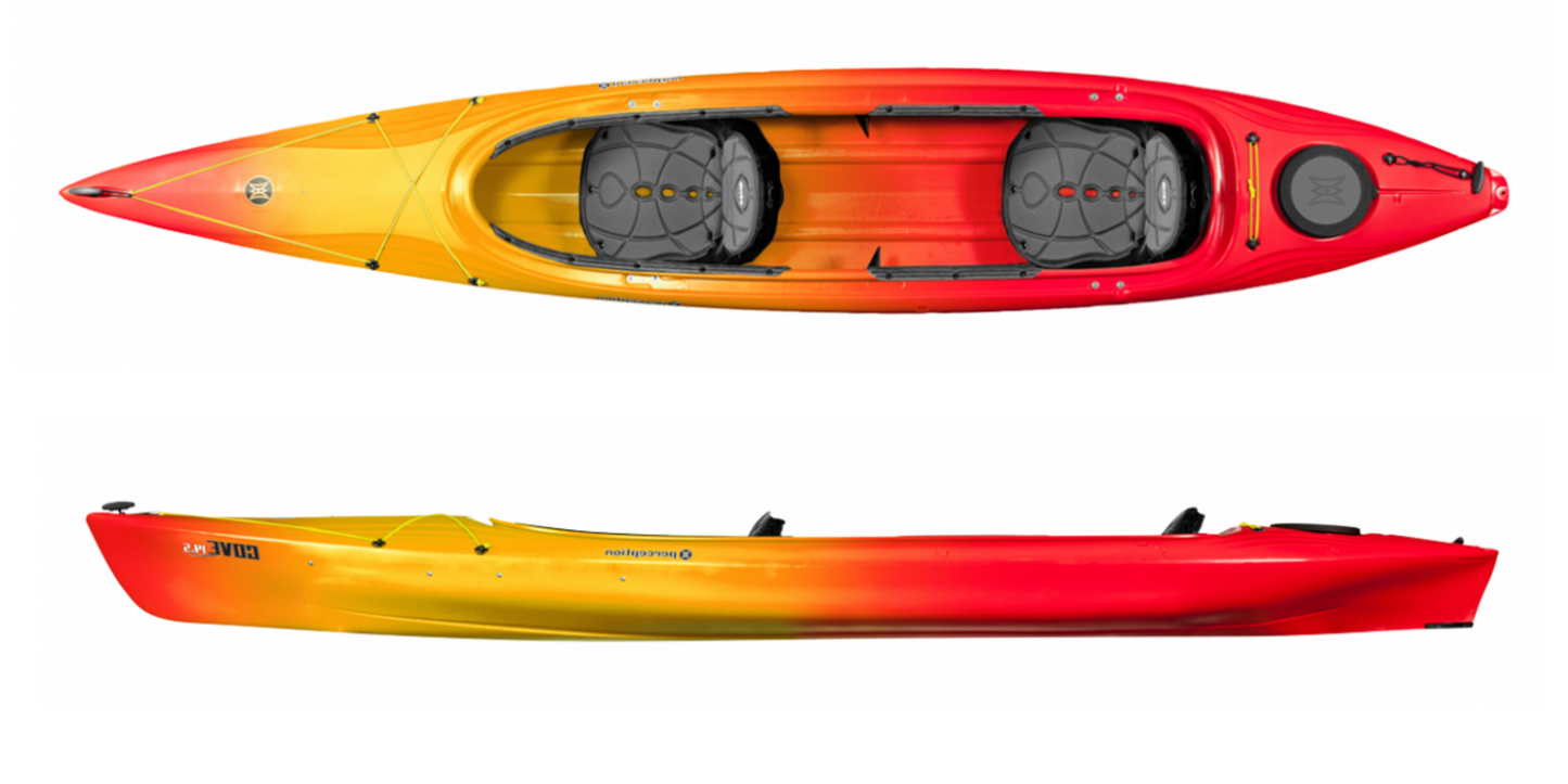 The Perception Cove tandem kayak is a comfortable and exceptionally versatile two-seater that’s well-equipped for adventure. Fun for beginners to intermediates, the boat’s do-it-all design makes easy work of any flat water you can find, including lakes, ponds, rivers and flat water coastal bays. This kayak’s versatile 14-foot-6 design offers exceptional stability and performance that makes paddling fun for the entire family. The super-cushy ergonomic seats maintain comfort throughout the day, while the extra-roomy cockpit with padded leg support along the edge is easy to get in and out of and gives you the freedom to relax on the water.