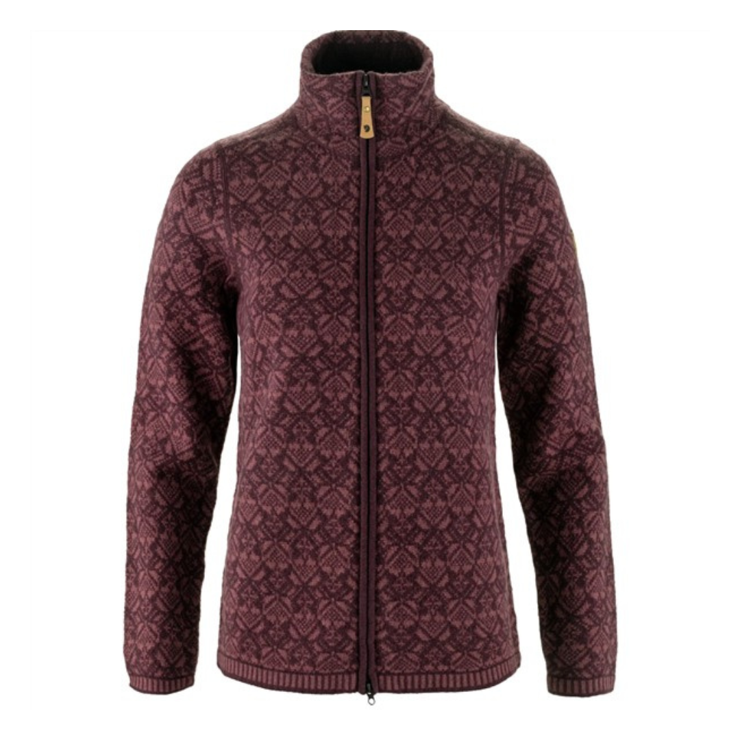 Beautiful jacquard-knitted cardigan in soft, warm lambswool. Two-way zipper at the front and a high straight collar to keep the neck warm. A classic model that is just as suitable for winter walks as it is for everyday use. 100% lambswool. Pattern inspired by Scandinavian folklore. Two-way zipper. Little leather logo on the sleeve.