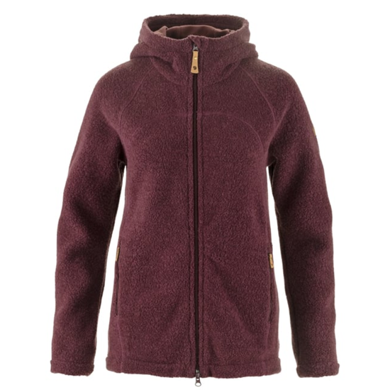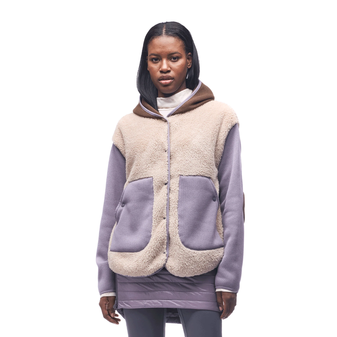 Loose-fit jacket combining Thermal Pro® Polartec® and comfy pile fleece for a blend of textures and performance. Fixed hood, snap-button pockets.