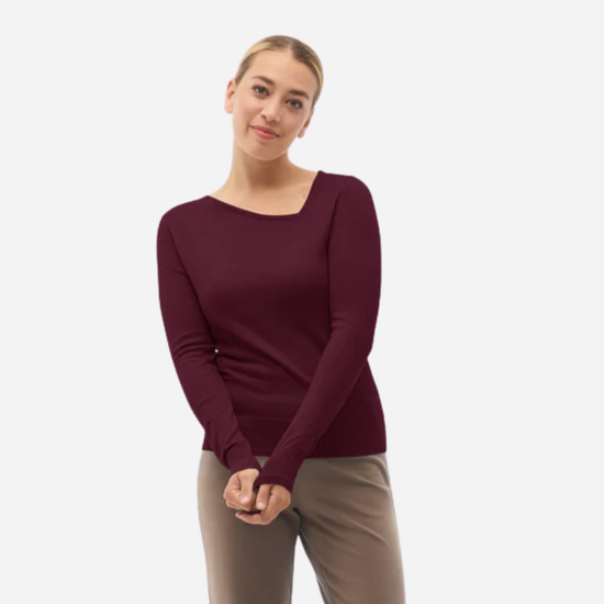This asymmetrical neckline sweater is office and soirée ready. Ultra Merino™ knit fabric is the perfect blend, providing all the advantages of extra-fine merino wool, with the added benefits of recycled nylon for enhanced durability and softness.