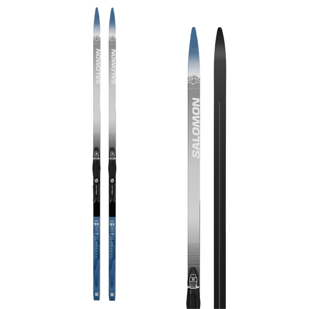 Designed for recreational skiers, Salomon's ESCAPE 51 PLUS waxless ski set offers maximum control and ease. Its low heel-toe camber and G2 Synchro grip give it a secure waxless kick. The ski is delivered pre-mounted with the safe Prolink Access Classic binding.